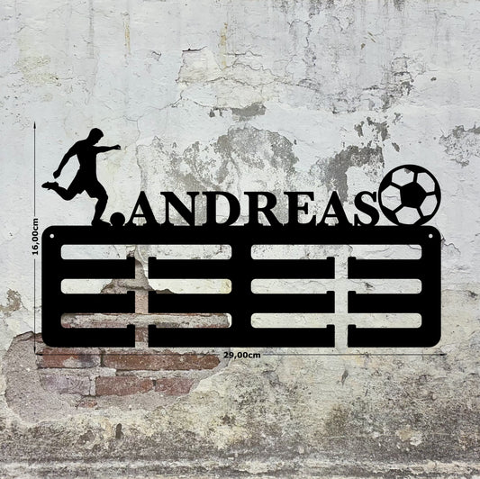 Personalisierter Medaillenhalter Fußball | mit Namen | 16x29 cm aus Holz | für Kinder & Fans | Natur, schwarz oder weiß lackiert